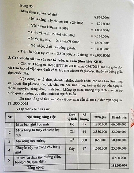 Còn về khoản xã hội hóa cơ sở vật chất 320.000 nghìn đồng, bà Lan cho biết, năm học 2019-2020 nhà trường dự toán mua bàn ghế cho học sinh, mua bảng từ, mở rộng sân trường… ước tính khoảng 181 triệu đồng. Trước đó, trường đã mời đại diện Hội CMHS khảo sát và lên dự toán các khoản, trên nguyên tắc công khai, không ép buộc, việc đóng góp là tùy từng phụ huynh chứ không cào bằng.