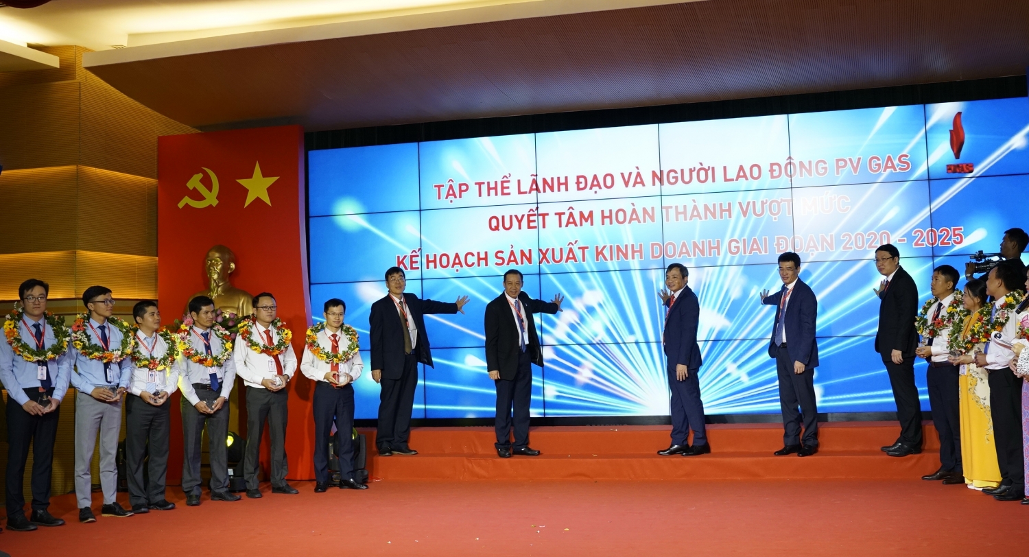 Với sự chứng kiến của các đại biểu và toàn thể Hội nghị, các lãnh đạo cao nhất của HĐQT, Ban Tổng giám đốc, Công đoàn, Hội Cựu chiến binh, Đoàn Thanh niên PV GAS đã thực hiện nghi thức cam kết thi đua "Hoàn thành vượt mức Kế hoạch SXKD giai đoạn 2020-2025”.