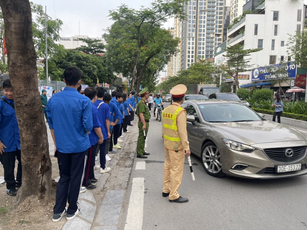 | Lực lượng phân luồng tránh ùn tắc giao thông tại điểm thi trường THPT Chu Văn An |