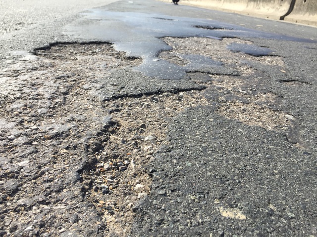 Mặt dù mới được sửa chữa nhưng mặt đường tiếp tục xuống cấp loang lổ, lở loét như thế này