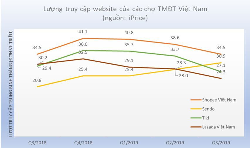 Trái ngược với sự tăng trưởng của Sendo, trong quý III/2019, số liệu thống kê từ Bản đồ Thương mại điện tử Việt Nam của iPrice cho thấy, các đối thủ lớn của Sendo là Shopee Việt Nam, Tiki, và Lazada Việt Nam đều chững lại về lượng truy cập website.