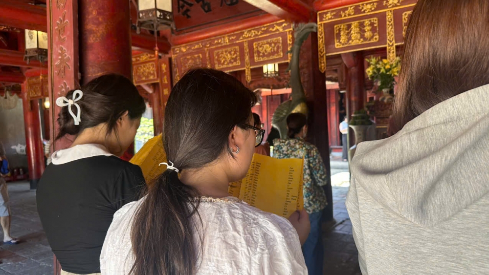| Nhiều sĩ tử cẩn thận viết sớ và đọc sớ khi khấn tại Văn Miếu - Quốc Tử Giám |