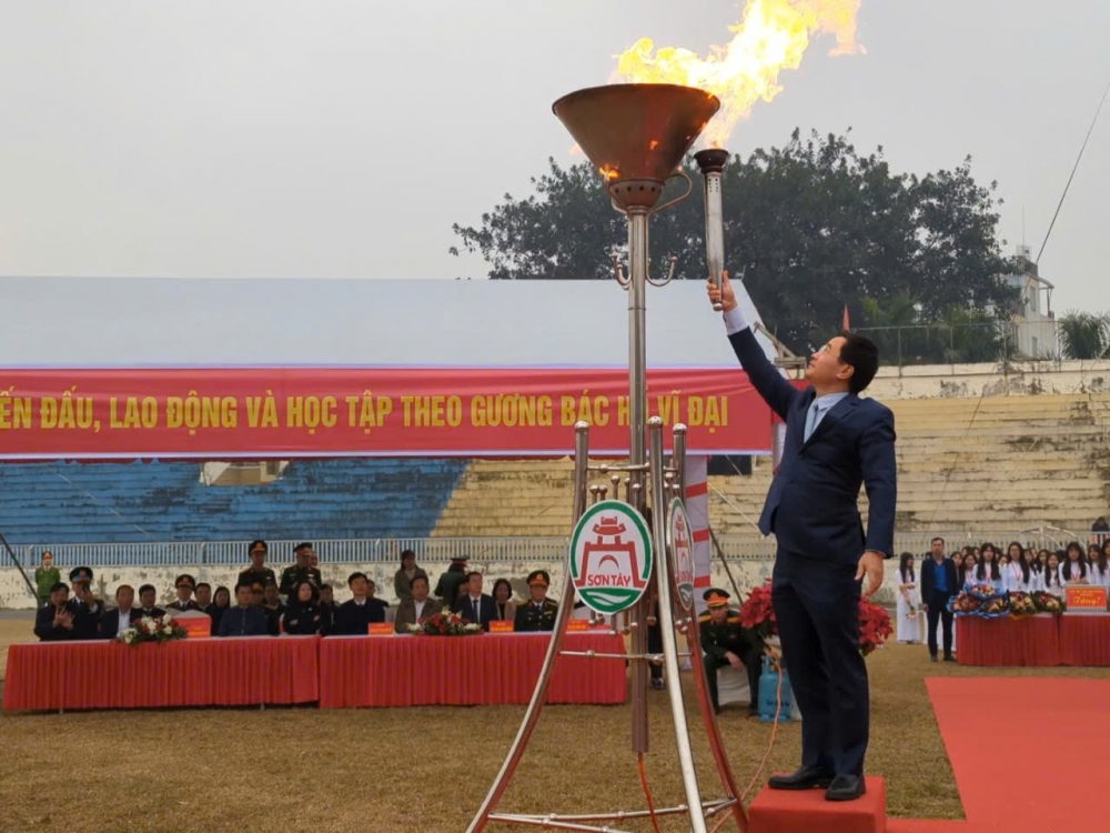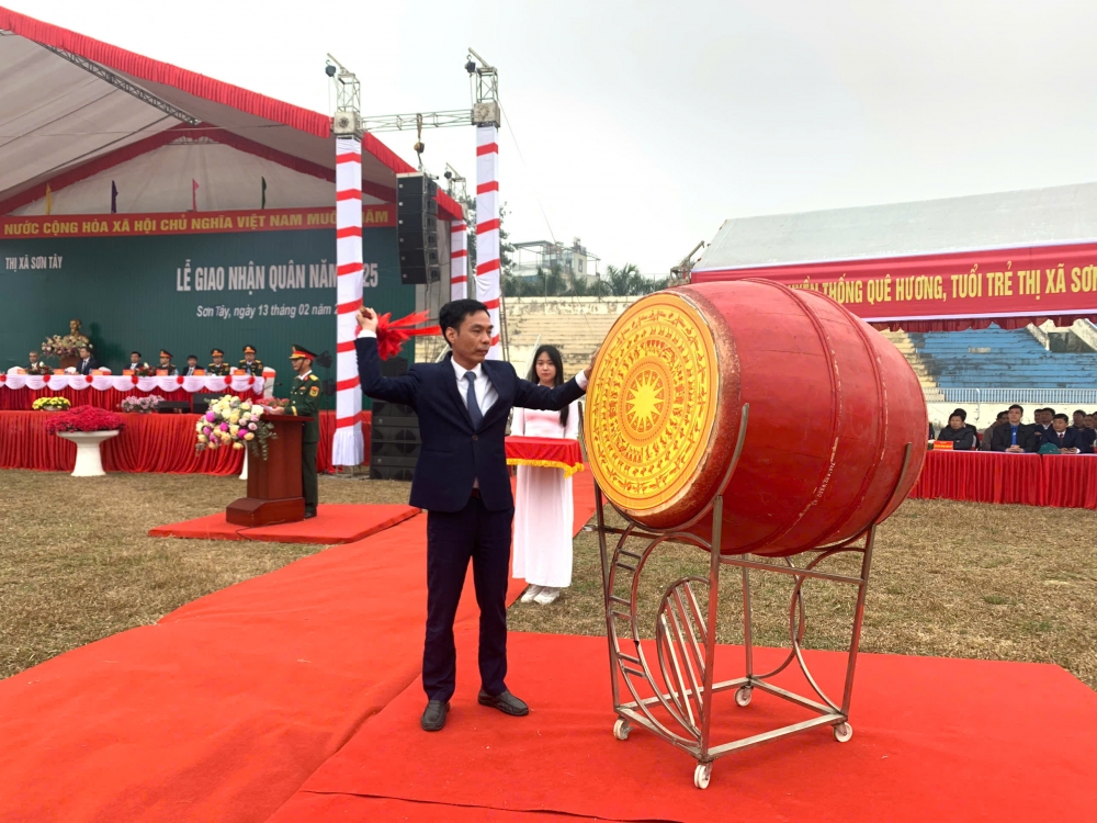 Tại buổi lễ giao nhận quân, đồng chí Trần Anh Tuấn, Bí thư Thị ủy Sơn Tây đã thắp lửa truyền thống, đồng chí Nguyễn Quang Hán, Phó Bí thư Thường trực Thị ủy, Chủ tịch HĐND thị xã nổi hồi trống giao quân.