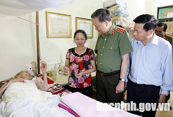 Theo đó, Đại tướng Tô Lâm, Ủy viên Bộ Chính trị, Bộ trưởng Bộ Công an cùng các ông Nguyễn Nhân Chiến, Ủy viên TƯ Đảng, Bí thư Tỉnh ủy, Trưởng Đoàn ĐBQH tỉnh; ông Nguyễn Văn Long, Ủy viên BTV Tỉnh ủy, Giám đốc Công an tỉnh đã đến thăm, tặng quà các thương, bệnh binh đang điều trị tại Trung tâm Điều dưỡng thương binh Thuận Thành (huyện Thuận Thành, tỉnh bắc Ninh).