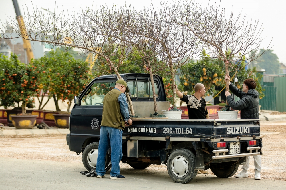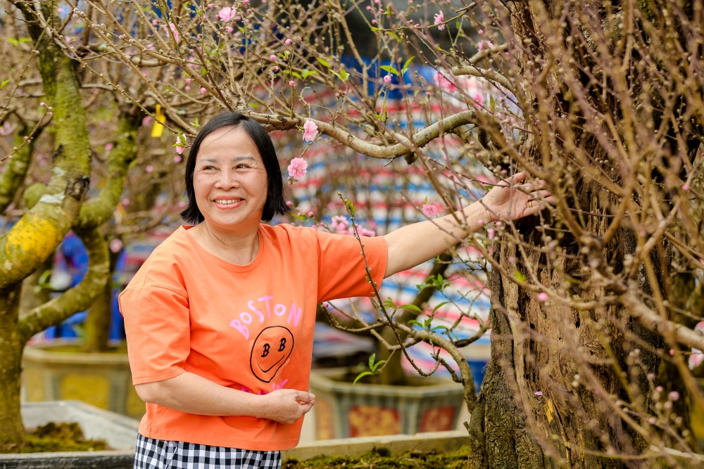 | Theo bà Nguyệt, những ngày này, khách hàng thường đi mua vào cuối giờ trưa hoặc chiều tối vì thời điểm dân công sở đi làm về. Khách đến mua thường chọn những cây đào nhiều hoa, nụ và dáng độc lạ. "Đào phai ghép có dáng độc lạ và uyển chuyển hơn so với các loại đào khác. Đặc biệt, hoa để được rất lâu vì thế nhiều khách mua sớm về chưng", bà Nguyệt nói. |