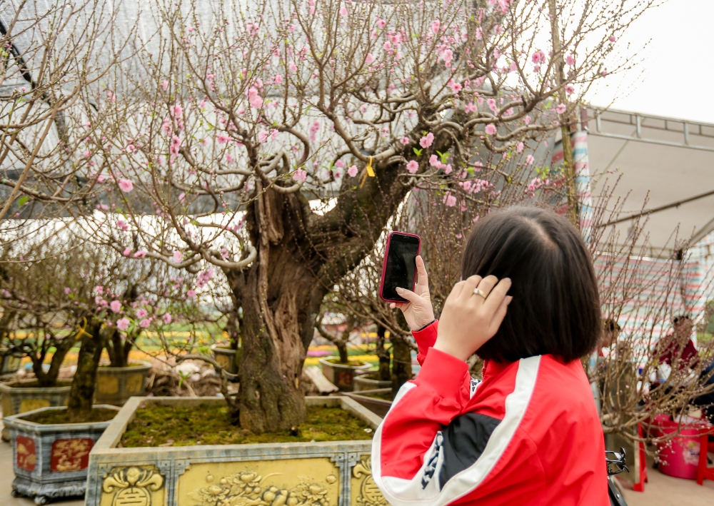 | Người dân không khởi trầm trồ trước vẻ đẹp của cây đào ra hoa sớm. |