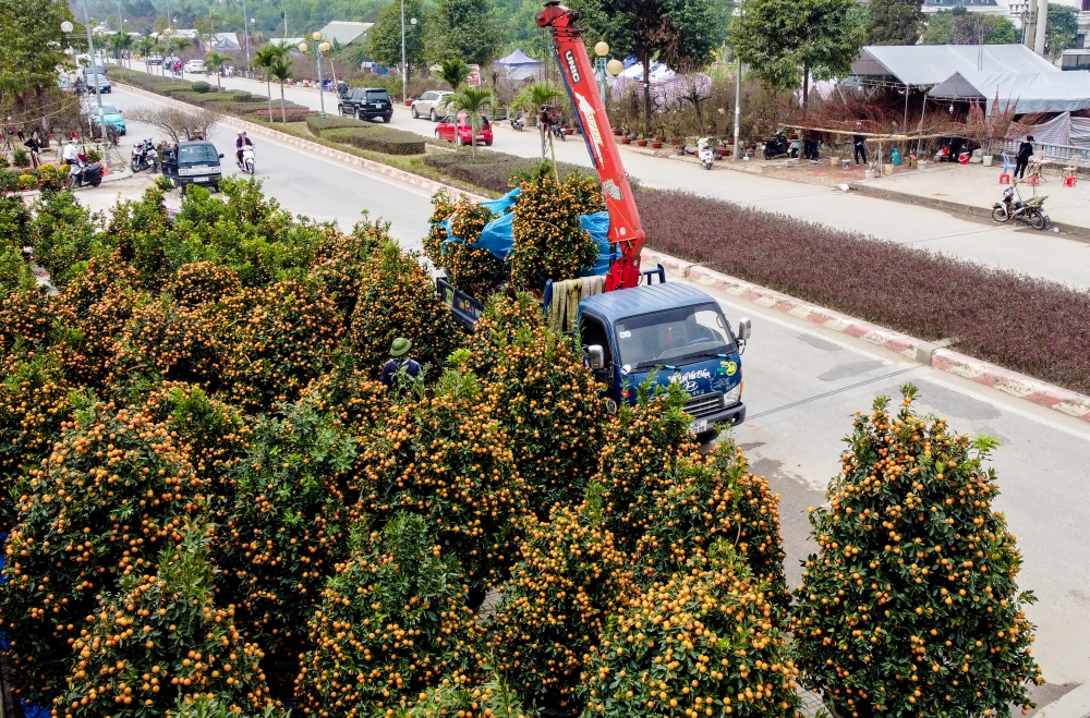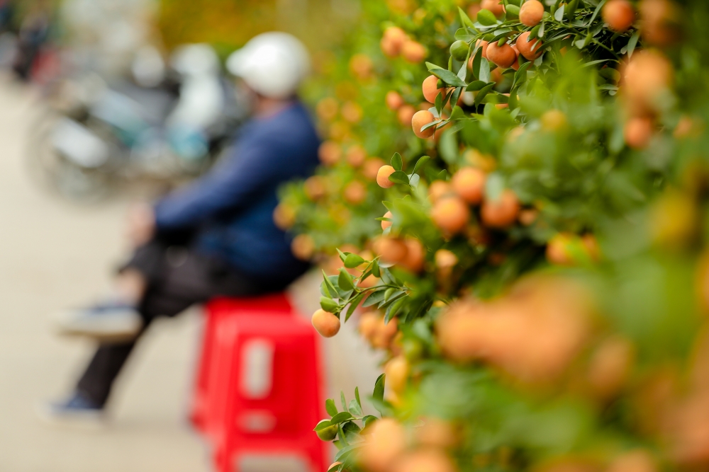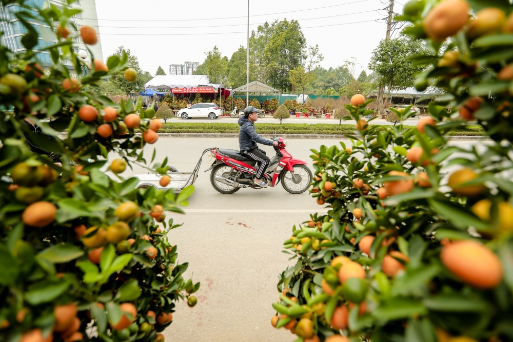 | Những chậu quất được bày bán trên đường Nguyễn Duy Hiệu. Theo tiểu thương, bắt đầu vận chuyển những cây quất ra thị trường từ khoảng 1 tuần nay. Những ngày này, để cây phát triển tốt, quả chín vàng đều, lá xanh mượt, người chăm sóc phải tăng cường chăm bón, tưới nước cho cây. Với thời tiết hanh khô, cây được tưới 2 lần/ngày để đảm bảo đủ độ ẩm. |