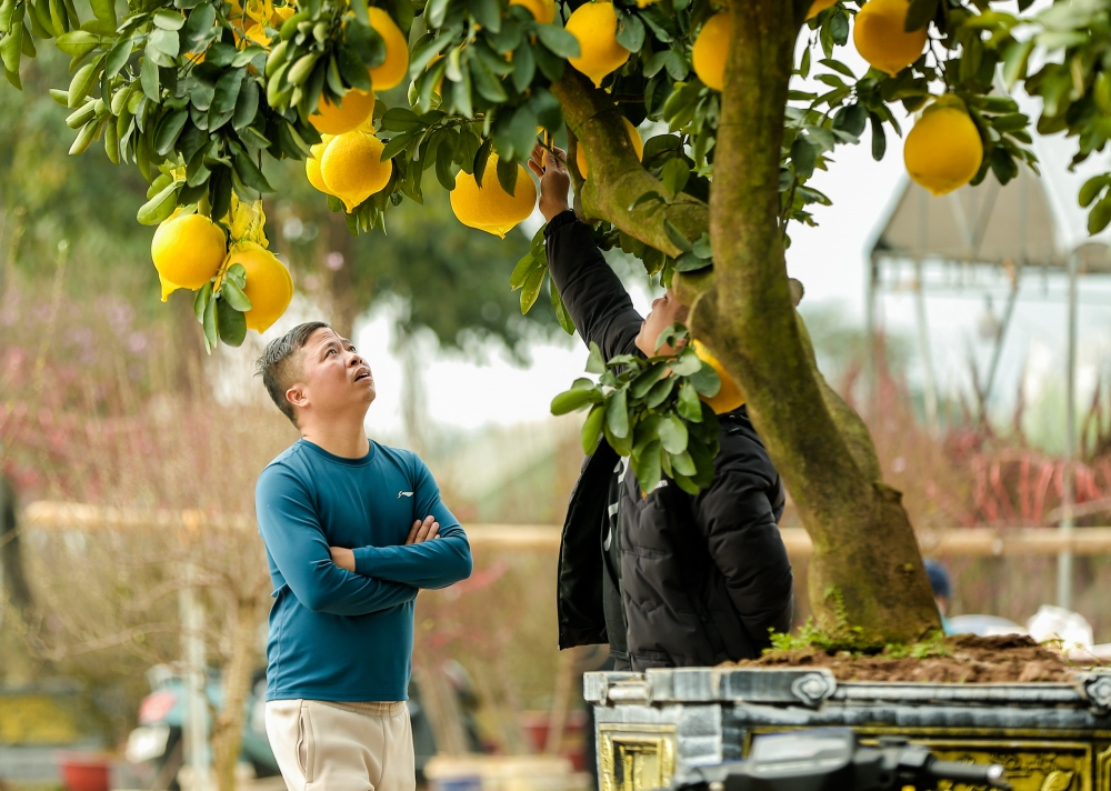 | Anh Quân (phường An Hưng, TP Thanh Hoá) tìm mua bưởi về chưng Tết. Theo tìm hiểu của anh Quân, năm nay giá trung bình các cây dao động 12 - 13 triệu đồng/một cây, những cây bưởi có giá đắt nhất chỉ vào khoảng 25 triệu đồng/một cây. Đây là loại bưởi gốc được lấy từ Hưng Yên, giá năm nay đắt hơn năm ngoái khoảng 2 đến 4 triệu đồng. |