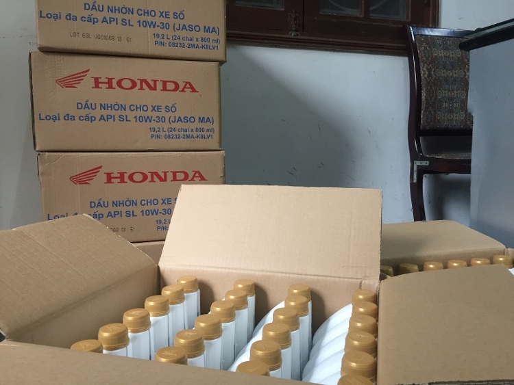 Theo nhà chức trách, 144 chai dầu nhớt giả mạo nhãn hiệu Honda loại 800ml/chai nêu trên được đựng trong 6 thùng cacton có in đầy đủ các thông tin về nhãn hiệu, thông tin kỹ thuật, cảnh báo, số lô và ngày sản xuất. Trên các chai nhớt đều in nhãn hiệu “HONDA” và “hình cánh chim” với các bố trí, cách ghi nhãn như của dầu nhớt Honda chính hãng.