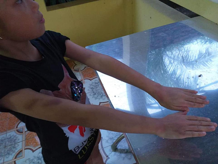 | Những vết tím bầm trên hai cánh tay của học sinh. (Ảnh facebook Vũ Ngoan). |