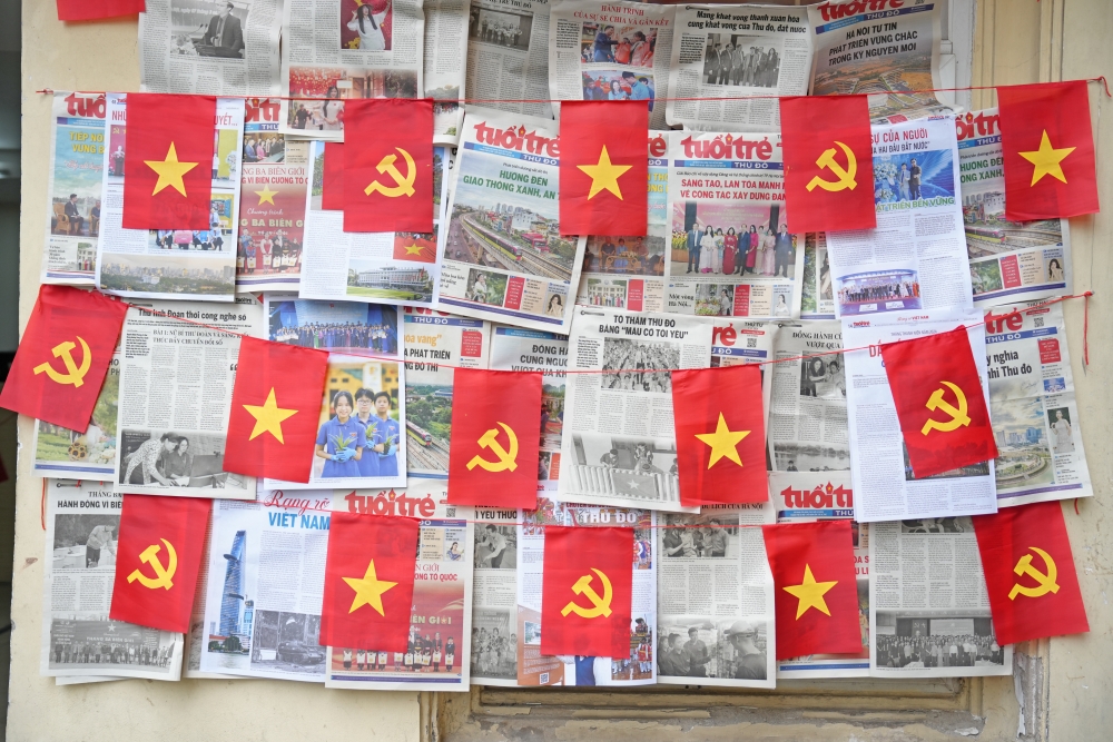 | Nhiều góc cơ quan, góc làm việc được trrang hoàng rực rỡ với cờ đò sao vàng và các ấn phẩm yêu nước |