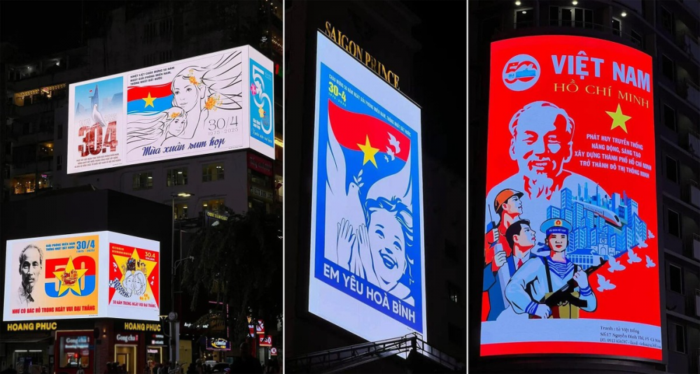 | Hình ảnh chào mừng kỷ niệm 30/4 xuất hiện trên các nhà cao tầng |