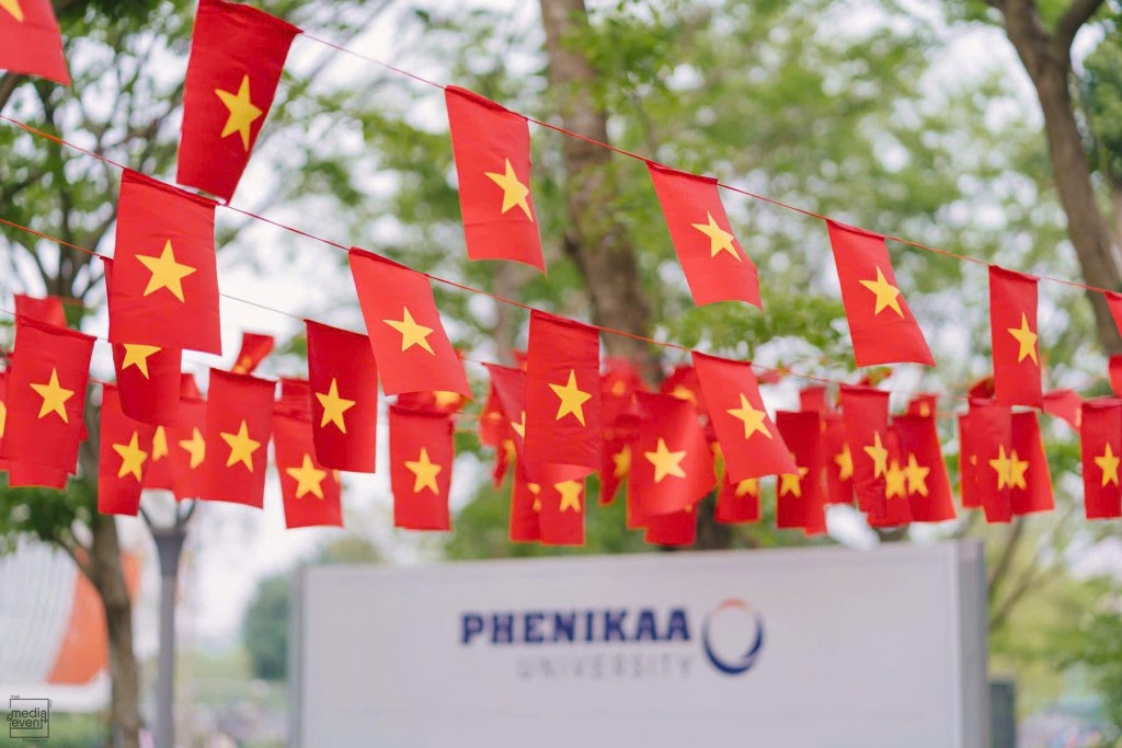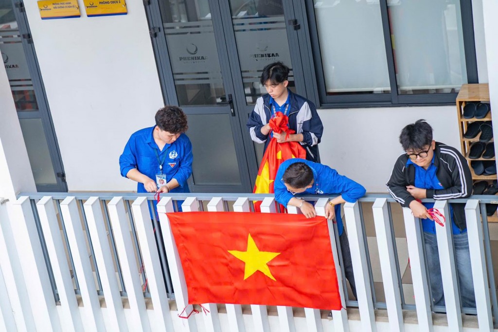 | Sinh viên trường Đại học Phenikaa cùng nhau chuẩn bị hàng trăm lá cờ Tổ quốc, cờ Đảng làm thành những dải cờ hoa rực rỡ trong khuôn viên trường học |