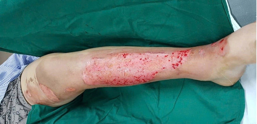 Sau gần hai tuần, vùng da bỏng ở bụng và cẳng chân trái xuất hiện tình trạng nhiễm trùng nặng, chảy dịch mủ, bốc mùi hôi và có dấu hiệu hoại tử. Khi tình trạng chuyển biến nghiêm trọng, người bệnh mới được đưa đến bệnh viện trong tình trạng toàn thân suy kiệt, nguy cơ đe dọa tính mạng.