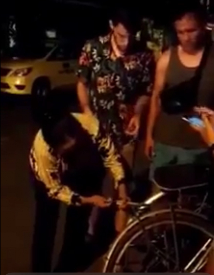 | 2 vị khách rất bất ngờ khi xe đạp của mình bị người khác khóa lại (ảnh: Cắt từ clip) |