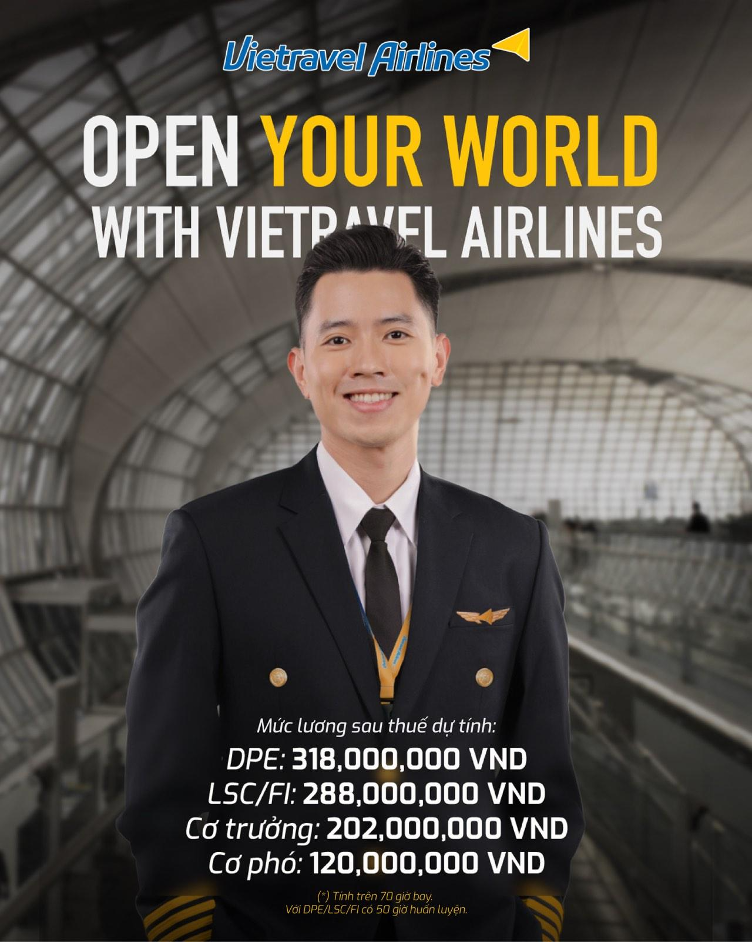 Điểm đáng chú ý, ngoài lương cơ bản, phi công Vietravel Airlines còn được hưởng thêm nhiều chính sách đãi ngộ: hỗ trợ thu nhập và nhà ở ngay trong giai đoạn huấn luyện, vé máy bay cho gia đình, cùng các phúc lợi đặc biệt khác.