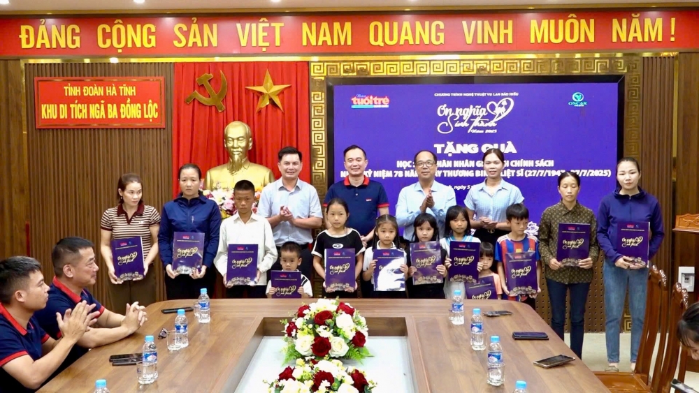 | Đoàn công tác Báo Tuổi trẻ Thủ đô trao quà và học bổng cho các em học sinh là thân nhân các gia đình chính sách tại xã Đồng Lộc. |