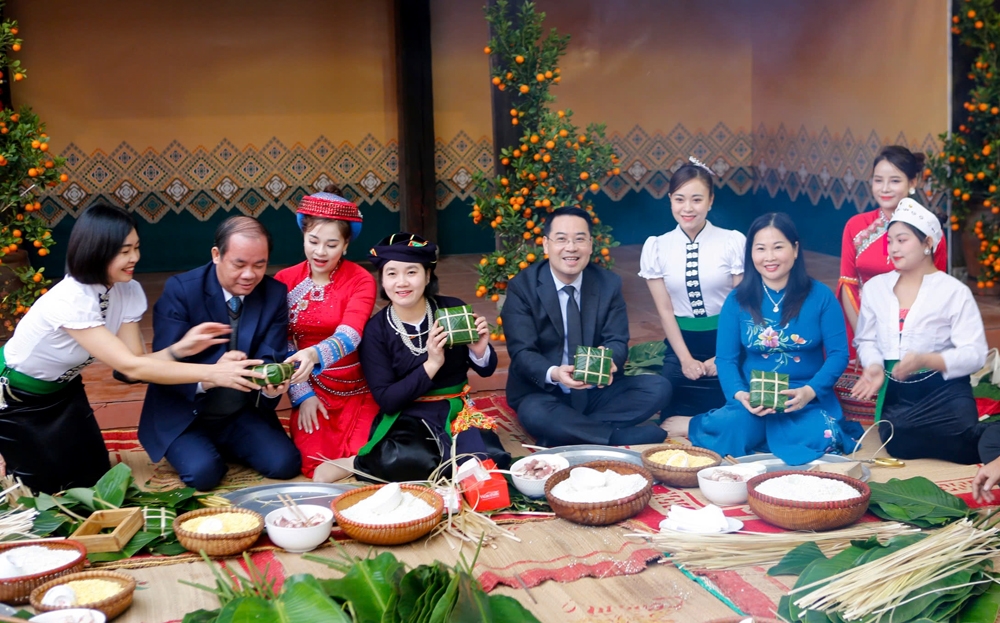 | Các đồng chí Tạ Văn Long - Phó Bí thư Thường trực Tỉnh ủy, Chủ tịch HĐND tỉnh; Nguyễn Tuấn Anh - Phó Bí thư Tỉnh ủy, Chủ tịch UBND tỉnh; Vũ Thị Hiền Hạnh - Phó Chủ tịch UBND tỉnh, Trưởng ban Chỉ đạo Tổ chức kỷ niệm những ngày lễ lớn và phát triển du lịch tỉnh Yên Bái trải nghiệm hoạt động gói bánh chưng. |